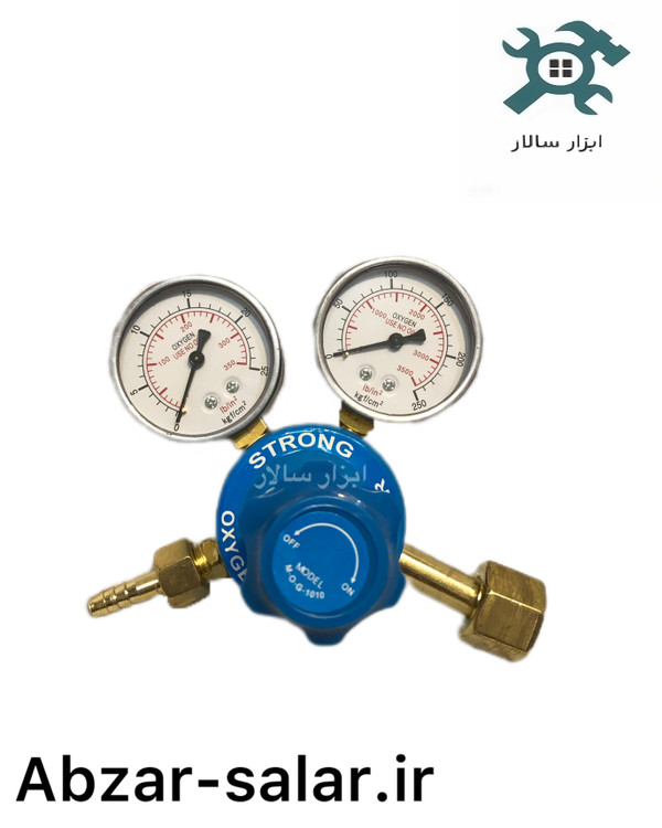 • رگلاتور اکسیژن STRONG: دارای دو گیج فشار (ورودی و خروجی) برای کنترل دقیق جریان اکسیژن، با بدنه برنجی و اتصالات استاندارد
