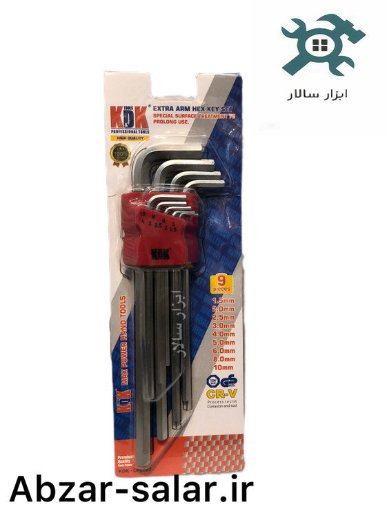 ست آلن ۹ عددی KDK مدل EXTRA ARM – ساختهشده از فولاد کروم-وانادیوم (CR-V)، مناسب برای تعمیرات صنعتی، تأسیساتی و مکانیکی با طراحی حرفهای و سطح ضدسایش